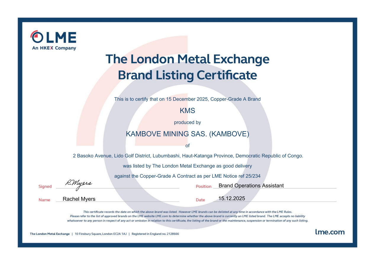 2025年12月15日,中國有色集團出資企業(yè)剛波夫礦業(yè)股份有限公司(以下簡稱:中色剛波夫)“KMS”品牌電解銅正式獲批倫敦金屬交易所(LME)交割品牌,即日起可在全球LME倉庫交割,標(biāo)志著中色剛波夫“KMS”電解銅成為全球銅供應(yīng)鏈可信賴的“標(biāo)準(zhǔn)品”。